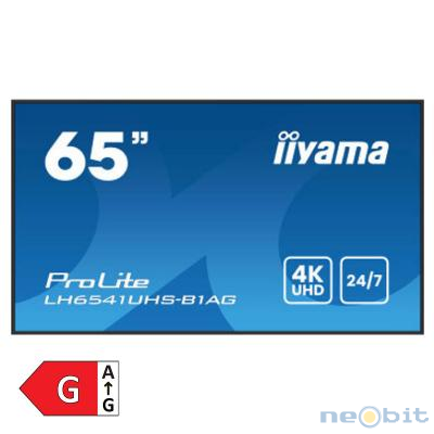 IIYAMA ProLite LH6541UHS-B1AG 64,5" (164cm) 4K UHD VA 24/7 Android zvočniki informacijski zaslon 65" Profesionalni zaslon za digitalno signalizacijo z ločljivostjo 4K UHD in neprekinjenim delovanjem 24/7 V tankem ohišju z ozkim robom je iiyama LH6541UHS-B1AG profesionalni zaslon za digitalno signalizacijo, ki omogoča neprekinjeno delovanje 24/7 v pokončni ali ležeči postavitvi. 500cd/m2 visoko svetel VA panel z ločljivostjo 4K UHD (3840x2160) zagotavlja izjemno barvno in slikovno zmogljivost. Z vgrajenim medijskim predvajalnikom lahko neposredno na zaslonu predvajate svojo najljubšo glasbo ter prikazujete videoposnetke, fotografije in slike. 4K Ločljivost UHD (3840x2160), bolj znana kot 4K, ponuja ogromno vidno površino s štirikrat več informacijami in delovnega prostora kot zaslon Full HD. Zaradi visoke gostote pik (DPI) prikazuje neverjetno ostro in jasno sliko. LAN nadzor LAN Control omogoča prilagoditve v meniju OSD zaslona prek vašega omrežja (programska oprema ni vključena). VA tehnologija VA panel ponuja višji kontrast, globlje črne odtenke in bistveno boljše kote gledanja kot standardna TN tehnologija. Slika je odlična ne glede na kot gledanja. AG premaz Protiodsevni premaz (Anti-Glare) se uporablja pri profesionalnih zaslonih, da prepreči težave z odsevi in vplivom zunanjih svetlobnih virov na reprodukcijo barv, kontrast in ostrino. Prav tako zmanjša občutljivost zaslona na prah, maščobo in madeže. Vgrajen medijski predvajalnik (pivot ni podprt) Predvajajte svojo najljubšo glasbo ter prikazujte videoposnetke, fotografije in slike neposredno na zaslonu z USB ključka ali notranjega pomnilnika z vgrajenim medijskim predvajalnikom.