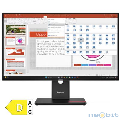 LENOVO ThinkVision T27-40 68,58cm (27") FHD IPS DP/HDMI/VGA monitor ThinkVision T24-40 Monitor je 27-palčni FHD IPS zaslon s širokim barvnim razponom 99 % sRGB in 99 % BT.709, ki zagotavlja živahno sliko iz kateregakoli zornega kota. Prilagodite zaslon svojemu delovnemu toku s 48-120 Hz dinamič no frekvenco osveževanja. Ta se dinamično prilagaja prikazani vsebini, kar omogoča bolj gladko gibanje pri hitro premikajočih se slikah ali zmanjšano frekvenco za varčevanje z energijo pri prikazu statič nih slik. Zaslon je izdelan z ultra tankim robom na vseh štirih straneh, kar pomeni manj motenj med gledanjem in več vsebine, ki jo je treba videti. Vgrajena tehnologija Natural Low Blue Light ščiti oči pred utrujenostjo tudi med dolgotrajnim delom. Poleg tega certifikat T?V Rheinland Eye Comfort s 5 zvezdicami zagotavlja, da je škodljiva modra svetloba bistveno zmanjšana kot kadarkoli prej. Neskončen seznam naprav, združljivih s Hubom, vključuje VGA, DP 1.2, HDMI 1.4, tri USB-A 3.2 ter en USB-C (15W) izhodni priključek, en USB-B 3.2 vhodni priključek za upravljanje perifernih naprav in prenos podatkov. Monitor lahko prilagodiš za bolj udobno in prijetno izkušnjo gledanja z ergonomskim stojalom, ki omogoča nagib, dvig, vrtenje in pivot funkcije. Monitor ponuja obilico funkcij, ne da bi pri tem vplival na okolje, saj sledi najnovejšim predpisom TCO 10.0, EU Energy Level in Energystar 8.0.