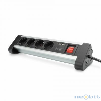 Digitus DA-70614 je namizni razdelilec 4x220V z 2x USB (5V/2A) in stikalom za vklop/izklop. Aluminijasto ohišje, 45° vtičnice, zaščita pred stikom, univerzalna pritrditev na mizo. Elegantna črno-siva izvedba za varno in praktično napajanje naprav.