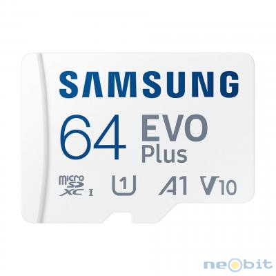 Samsung EVO Plus MB-MC64SA/EU microSDXC spominska kartica s kapaciteto 64 GB in vmesnikom UHS-I. Ponaša se s hitrostjo branja do 160 MB/s, razredi U3, V30 in A2 za predvajanje 4K video posnetkov in aplikacij. Združljiva z Android napravami, tablicami, prenosniki in igralnimi konzolami. S priloženim SD adapterjem.